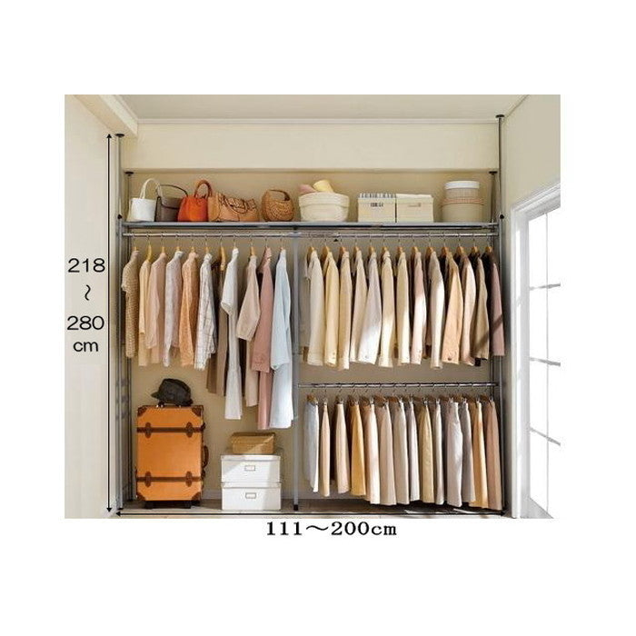 | サイズ | ■W111?200×D30×H218?280cm ■耐荷重108kg (上段48Kg/下段12kg/棚48Kg) ■商品重量/15.5Kg |