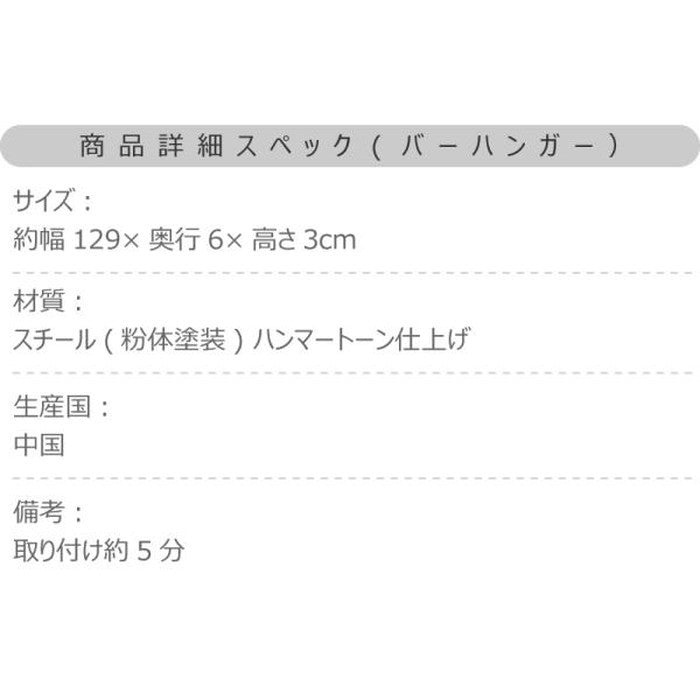 | 商品説明 | 手軽にハンガーにできる専用バー ボルトレスラック(DIS-683,684,685)に取り付ける専用バーです。 サイドフレームのバーに掛けるだけでハンガーとして使用ができます。 お部屋のハンガーはもちろん、お店の什器としてもおすすめです。 |