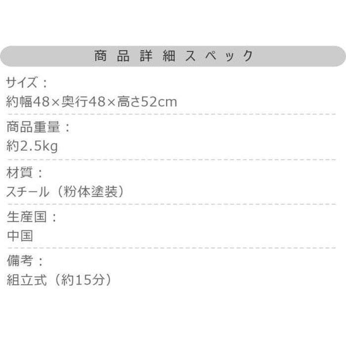 | スペック | 組立式 商品重量:約2(kg) 耐荷重:4kg 付属工具:六角レンチ 必要工具: 組立人数:1人 組立時間:15分 トレー取り外し可 ※製造段階でトレーを塗装する工程があり、吊り下げて作業を行うためにトレー側面にパンチングで小さな穴をあけております。不良品ではございませんので予めご了承ください。 |