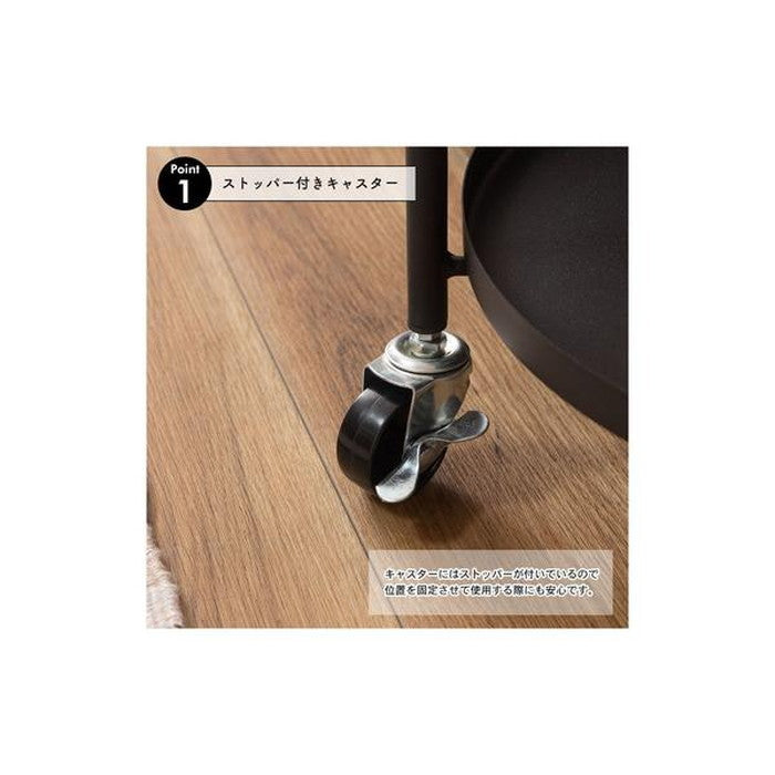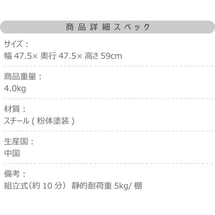| スペック | 組立式 商品重量:約4(kg) 耐荷重:5kg/棚 付属工具:六角レンチ 必要工具: 組立人数:1人 組立時間:15分 トレーの取り外しが可能 ストッパー付きキャスター |