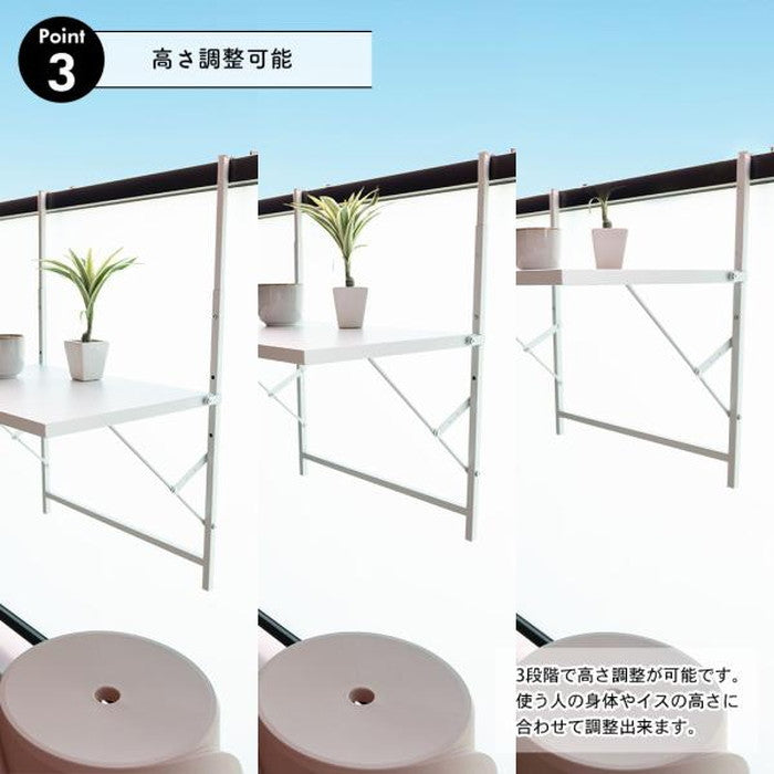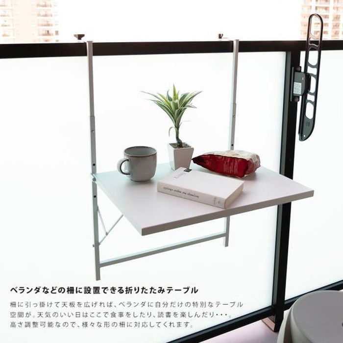 | 商品説明 | ベランダなどの柵に設置できる折りたたみテーブル 柵に引っ掛けて天板を広げれば、ベランダに自分だけの特別なテーブル空間が。 天気のいい日はここで食事をしたり、読書を楽しんだり・・・。 高さ調節可能なので、様々な形の柵に対応してくれます。 |