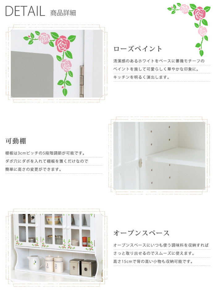 | 商品説明 | ■ オープン部内寸:(約)幅61×奥行15×高さ15cm■ 扉内内寸(小):(約)幅40×奥行14×高さ28cm■ 扉内内寸(大):(約)幅20×奥行14×高さ28cm■ 可動棚:各1枚・3cmピッチ 清潔感あふれるホワイト地に、ローズ柄をペインティング!扉付き収納棚は、高さ調節ができます!下部オープン収納には、料理を作る時によく使う調味料を収納出来るスペースを採用! |