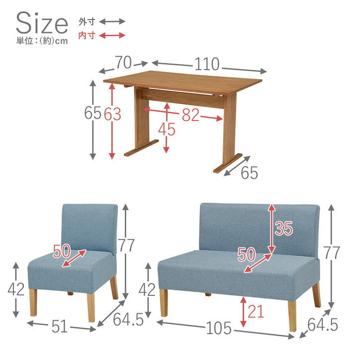 | サイズ | テーブル:(約)幅110×奥行70×高さ65cm、ソファ(1P):(約)幅51×奥行64.5×高さ77×座面高42cm、ソファ(2P):(約)幅105×奥行64.5×高さ77×座面高42cm |