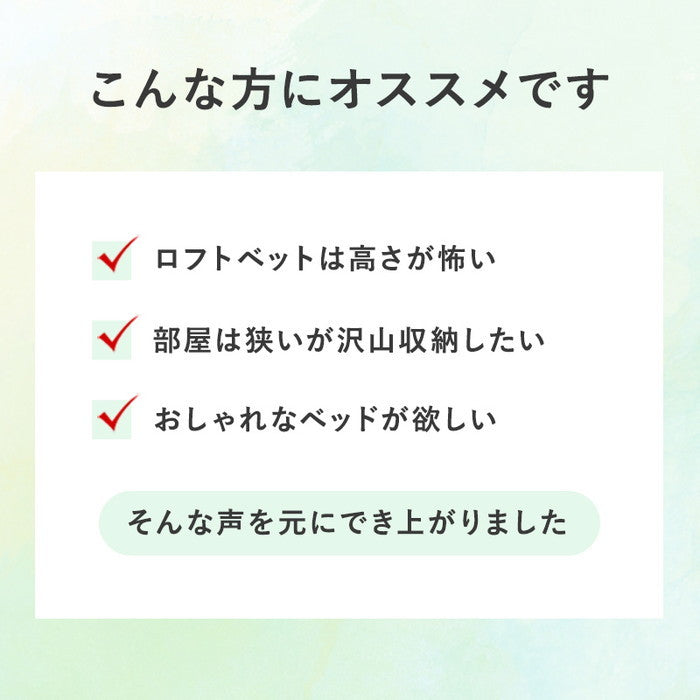 | 商品説明 | ■組立式■2口コンセント付■床面高4段階調節可能(組立時)■床面サイズ:W120×L195cm 床面高さが4段階に変えられ、床面下に大容量収納が可能。頑丈な造りの天然木すのこベッド。 |