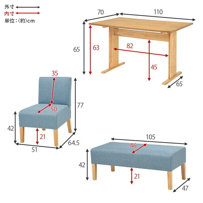 | サイズ | テーブル:(約)幅110×奥行70×高さ65cm、チェア(1P):(約)幅51×奥行64.5×高さ77×座面高42cm、ベンチ:(約)幅105×奥行47×高さ42×座面高42cm |