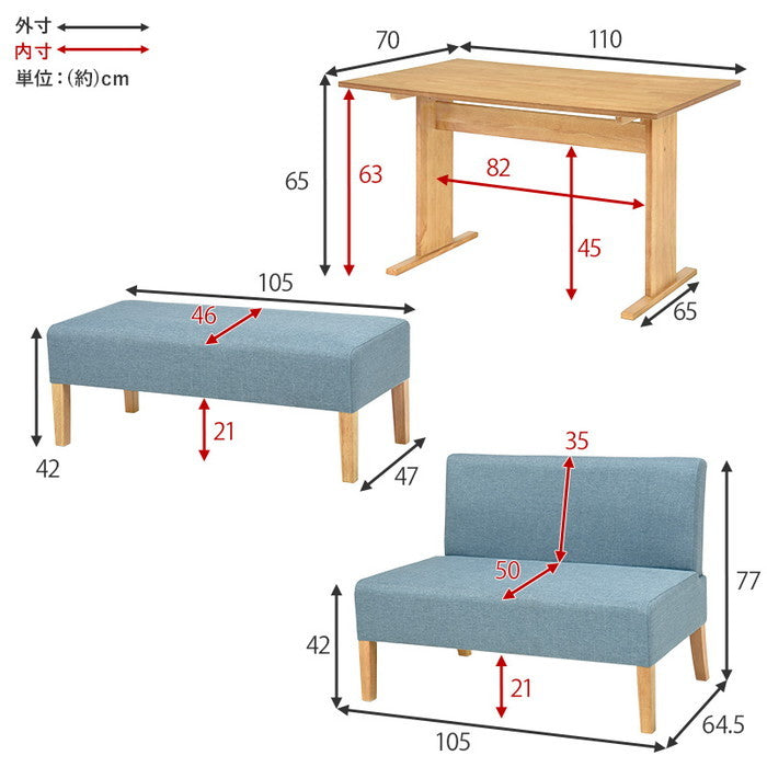 | サイズ | テーブル:(約)幅110×奥行70×高さ65cm、ソファ(2P):(約)幅105×奥行64.5×高さ77×座面高42cm、ベンチ:(約)幅105×奥行47×高さ42×座面高42cm |