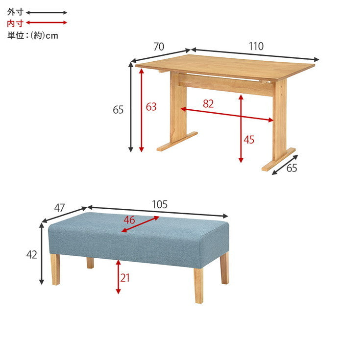 | サイズ | テーブル:(約)幅110×奥行70×高さ65cm、ベンチ:(約)幅105×奥行47×高さ42×座面高42cm |