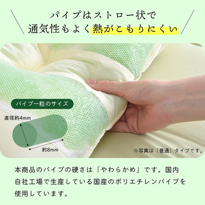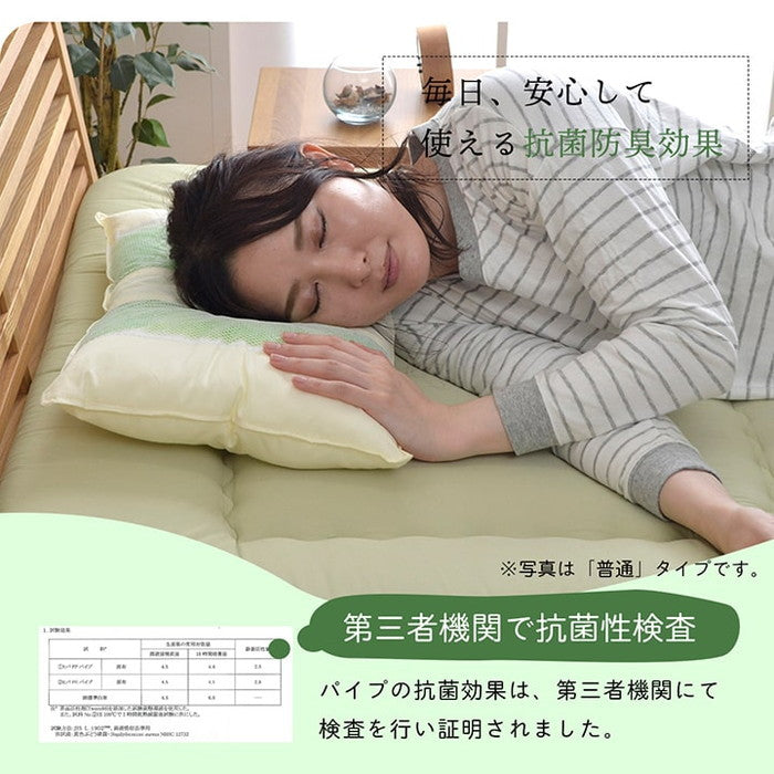 | 商品説明 | 選べる高さが3種類。ご希望のサイズを選んで下さい。ヒバエッセンス練り込みパイプを使用しています。青森県のヒバの木から抽出した「ヒバエッセンス」をメーカー独自の技術でパイプに加工しました。ヒバエッセンスにはヒノキチオールという、天然物質としては極めて抗菌性の高い成分が含まれています。(無加工品に比べ、抗菌・防臭効果があります。)ヒバエッセンスで安らかな森の眠りをご提案します。パイプ使用のため、通気性がよく、熱がこもらず心地よくご使用できます。リバーシブルタイプでひばパイプ側、ポリエステルわた側の2種類の触感を楽しめます。※中材の出し入れはできません。 洗濯表示:40℃以下の水温で弱い手洗いで洗濯してください。(洗濯機は使用できません。) 干し方=日陰のつり干しがよい。 |