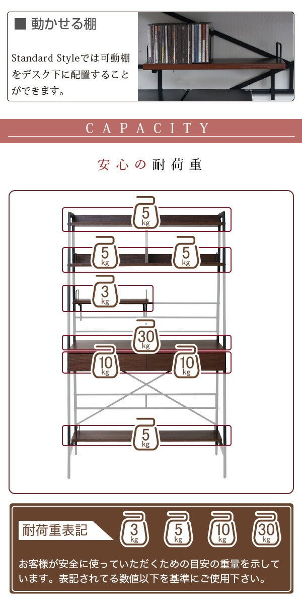 | サイズ | [外寸] 幅91×奥行48×高さ150cm [内寸] (上部収納上オープン部)幅87×奥行20×高さ5cm (上部収納左右オープン部)幅40.5×奥行24×高さ21cm (上部収納棚下空間高さ)スタンダード時45、フロア時75.5cm (デスク面)幅87×奥行45×高さ(スタンダード時)73(フロア時)42.5cm (デスク下空間)幅87×奥行45×高さ(スタンダード時)59.5(フロア時)29cm (引き出し左右)幅35.5×奥行33.5×高さ4.5(有効6.5)cm (可動棚)幅40.5×奥行15×厚み1.8cm (下棚)幅83×奥行20×厚み1.8cm 収納量・耐荷重 [上部収納棚]約5kg以下 [天板]約30kg以下 [引き出し]約10kg以下/杯 [可動棚]約3kg以下 [下棚]約5kg以下 梱包サイズ(cm)幅(横)×奥行(縦)×高さ:?95×50.5×13 ?94.5×50×12.5 梱包重量(?) :?22.6?11.7 |