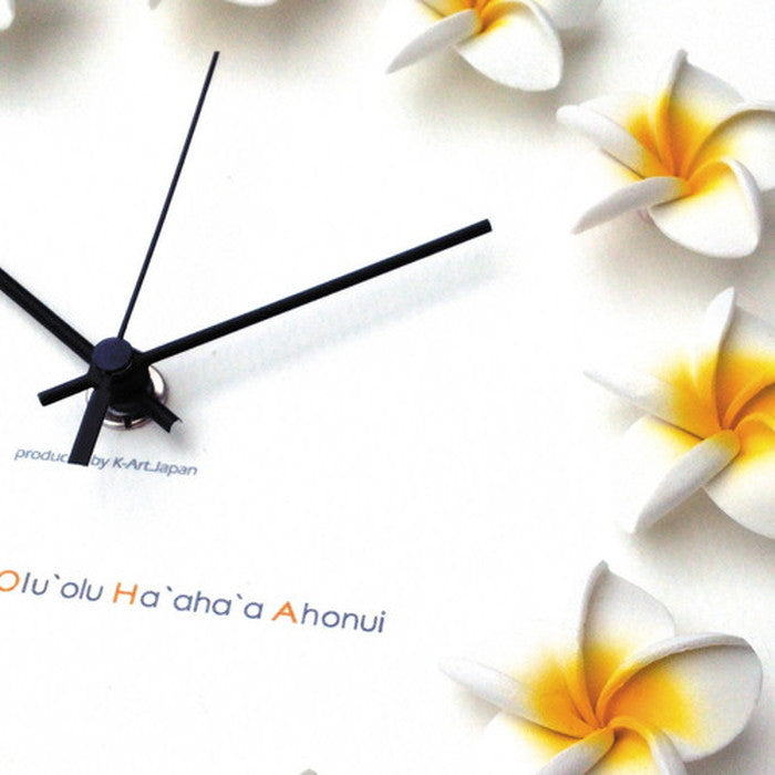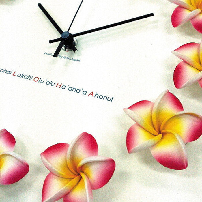 | 商品詳細 | ハワイアンに人気のフランジパニ(プルメリア)を文字盤にレイアウトした掛け時計です。ALOHAの文字がプリントしてあります。場所を選ばず飾れるサイズなのでご自宅用だけでなくギフトにもおすすめの商品です。音が気にならず、針がなめらかに動くSKPスイープムーブメント(連続秒針)を使用しています。単三乾電池×1本付(テスト電池)※安心の1年保証付です。 |