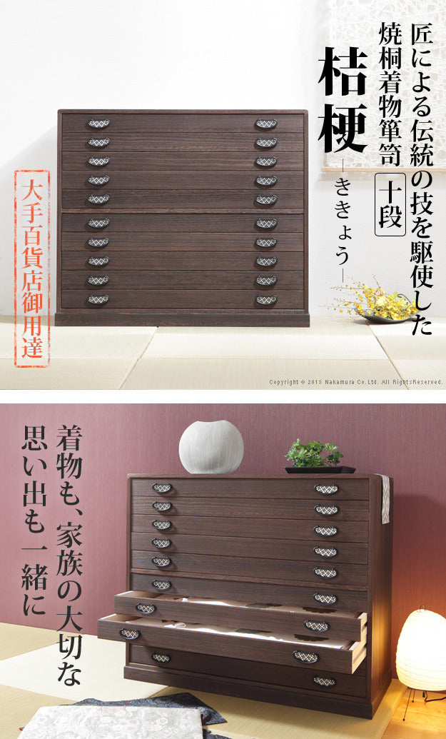 桐たんす 着物 収納 国産 焼桐着物箪笥 10段 桔梗 ききょう 桐箪笥 桐タンス 衣装タンス 衣装箱 桐衣裳ケース たんす チェスト 桐 桐天然木 たとう紙 保管 引出し 和箪笥 和たんす 和タンス 整理タンス 日本製 mu-12400008 店舗 カフェ ラウンジ ロビー ホテル 法人 タンス チェスト 収納 家具 北欧 モダン 家具 インテリア ナチュラル テイスト 新生活 オススメ おしゃれ