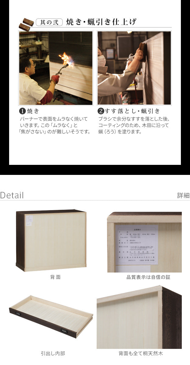 | 商品説明 | 【仕様】 本体:天然木(桐) 加工:字造り・との粉ロウ引き仕上げ・焼桐仕上げ 金具:亜鉛合金(黒色) ◎完成品 【サイズ】 幅99x奥行45.5x高さ84.5cm 重量:約30kg 引出し内寸:幅91x奥行40x高さ5.5cm |