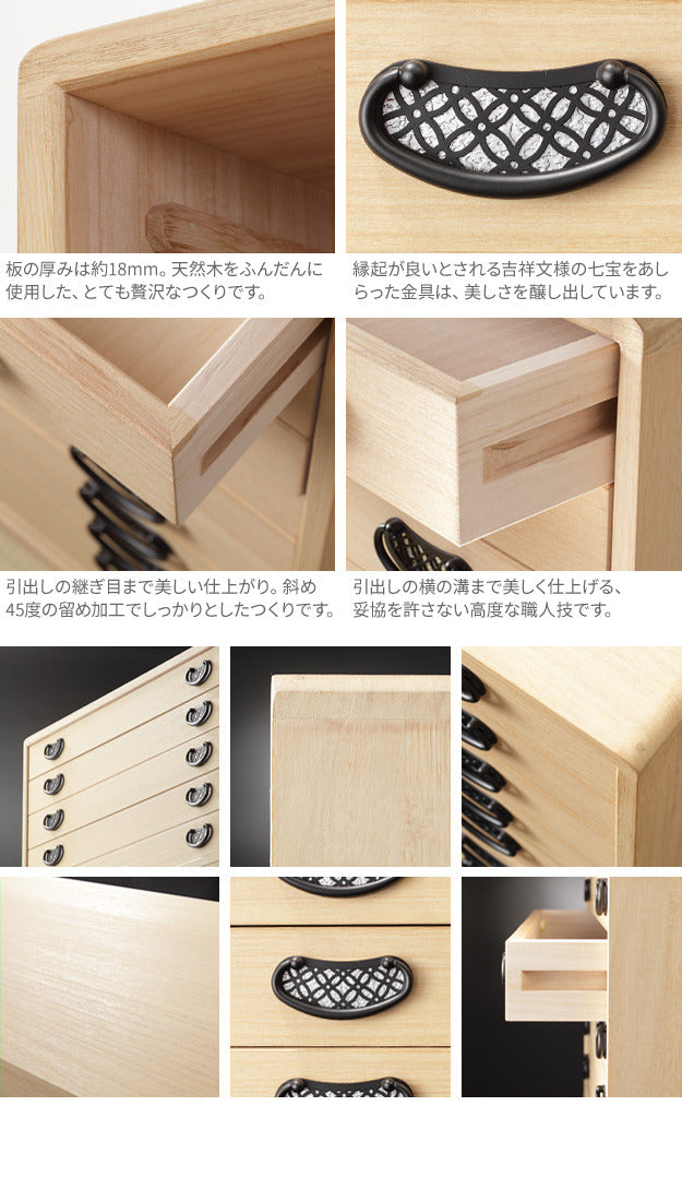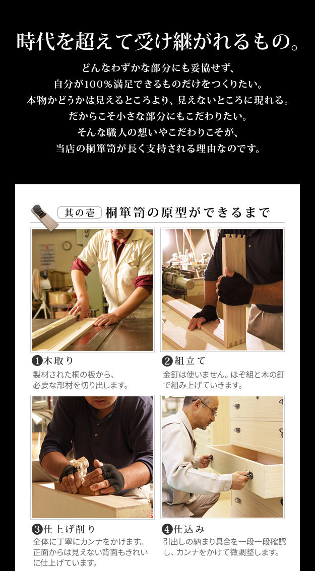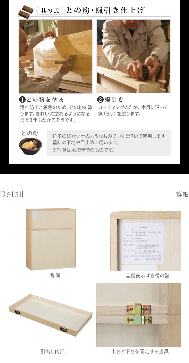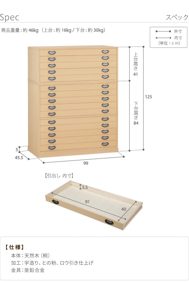 | 商品説明 | 【仕様】 本体:天然木(桐) 加工:字造り・との粉ロウ引き仕上げ 金具:亜鉛合金(黒色) ◎上下重ね式 【サイズ】 幅99x奥行45.5x高さ125cm 重量:約46kg(上台-約16kg/下台-約30kg) 引出し内寸:幅91x奥行40x高さ5.5cm |