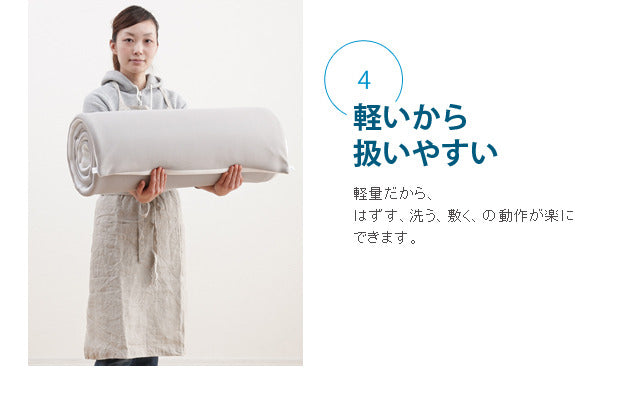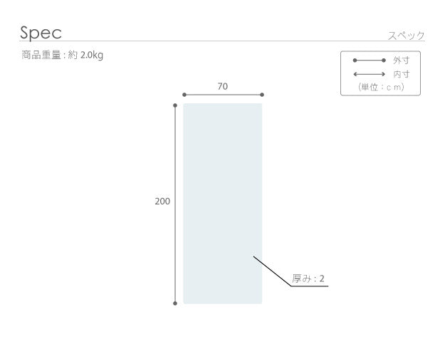 | 商品説明 | 【仕様】 中材:ポリエステル100%(ソフト立体構造織物) 側生地:ポリエステル100%(ハニカムメッシュ) 【サイズ】 本体:幅70x奥行200x厚さ2cm 重量:約2.0kg 中材:約2cm厚 完成品 |
