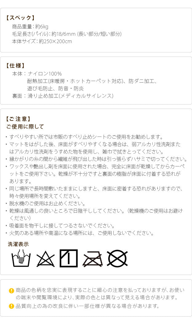 | 商品説明 | 【カラーバリエーション】 アイボリー・ダークグレー・モスグリーン・フォレストグリーン・アイスブルー・グレージュ・ネイビーグレー・ライトグレー 【仕様】 本体:ナイロン100% 裏面:滑り止め加工 【サイズ】 本体:約250x200cm 毛足長さ(パイル):約18/6mm 重量:約6kg |