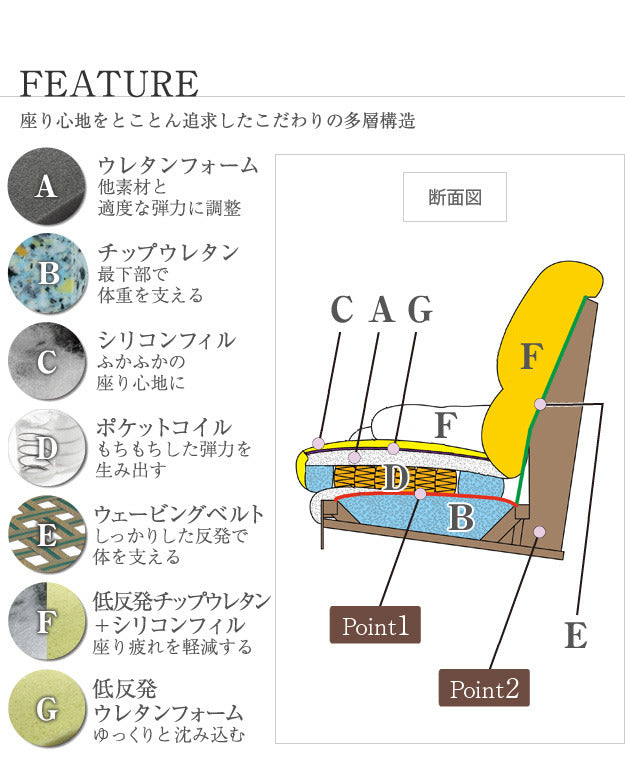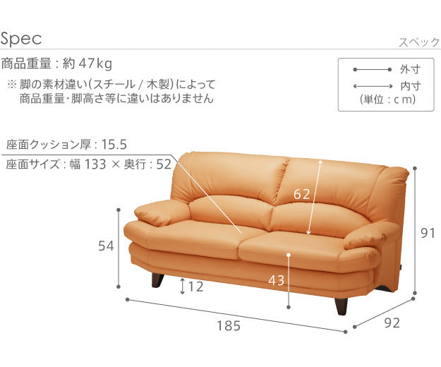 | 商品説明 | 【カラーバリエーション】 ダークブラウン・ブラウン・ミルクホワイト・グレー・ブラック・レッド 【脚部】 スチール・木製 【仕様】 張地:合成皮革 座面:低反発ウレタン・ウレタンフォーム・チップウレタン・シリコンフィル・Sバネ・ポケットコイル 背面:低反発チップウレタン・シリコンフィル・ウェービングベルト 構造部材:天然木・合板 脚部:スチール/天然木 ◎一部組立(脚部取付) 【サイズ】 幅185x奥行92x高さ91cm 重量:約47kg 座面高:43cm 座面幅:133cm 座面奥行き:52cm 背面高さ:62cm 肘掛けまで高さ:54cm ソファ下高さ:12cm ※一つひとつを職人が手作業で作っているため、数値に若干の個体差があります。 |