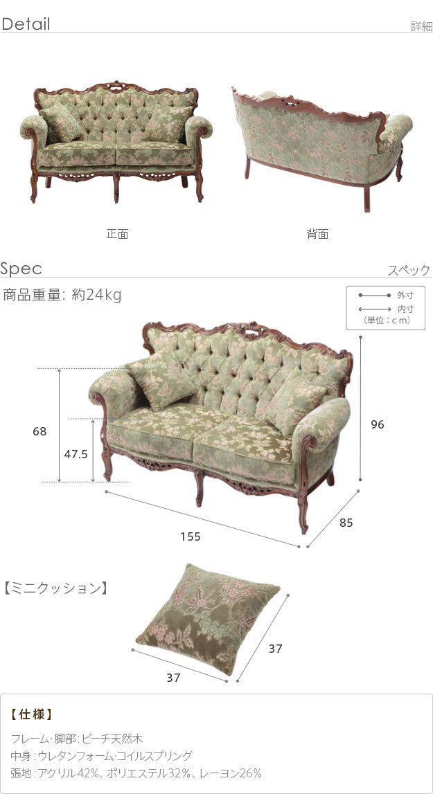| 商品説明 | 【仕様】 フレーム・脚部 - ビーチ天然木 中身 - ウレタンフォーム・コイルスプリング 張り地 - アクリル42%・ポリエステル32%・レーヨン26% 【サイズ】 [本体] 外寸:幅155x奥行85x高さ96cm 商品重量:約24kg [ミニクッション] 外寸:幅37x奥行37cm 完成品 イタリア製 |