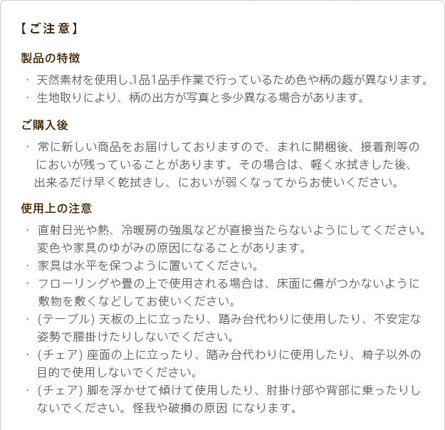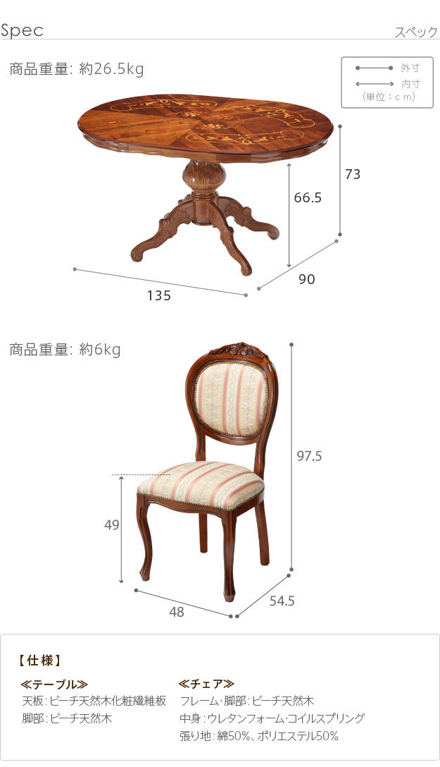 | 商品説明 | 【仕様】 [テーブル] 天板 - ビーチ天然木化粧繊維板 脚部 - ビーチ天然木 [チェア] フレーム・脚部 - ビーチ天然木 中身 - ウレタンフォーム・コイルスプリング 張り地 - 綿50%・ポリエステル50% 【サイズ】 [テーブル] 外寸:幅135x奥行90x高さ73cm 商品重量:約26.5kg [チェア] 外寸:幅48x奥行54.5x高さ97.5cm 商品重量:約6kg 一部組立(テーブル脚部) イタリア製 |