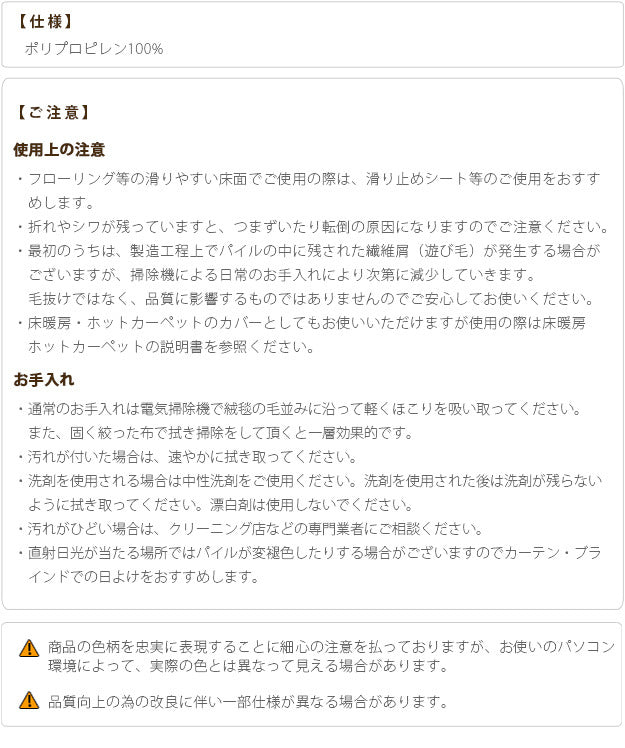 | 商品説明 | ※配送のご希望日時の指定を承ることができません。 【カラーバリエーション】 ダークブラウン・ライトベージュ 【仕様】 本体:ポリプロピレン100% 【サイズ】 本体:約230x160cm 毛足長さ(パイル):約10mm 重量:約9.5kg |