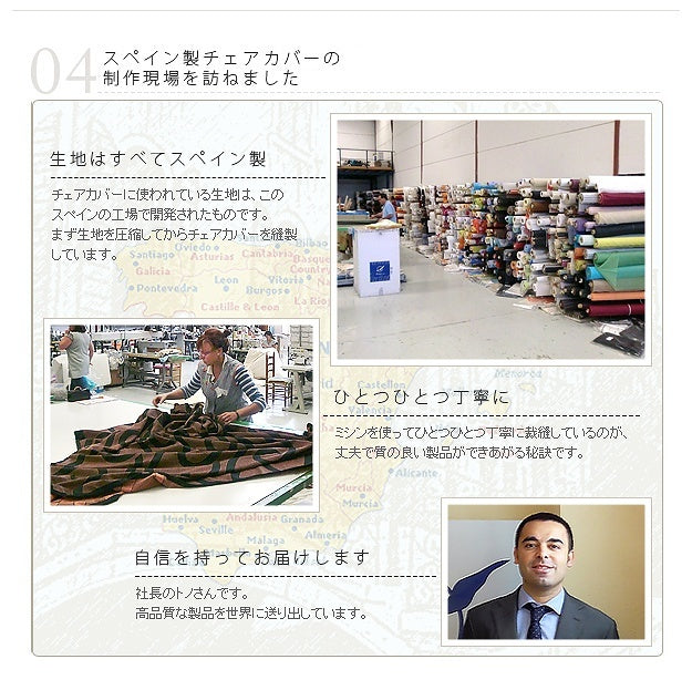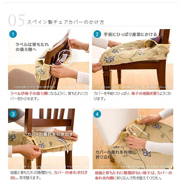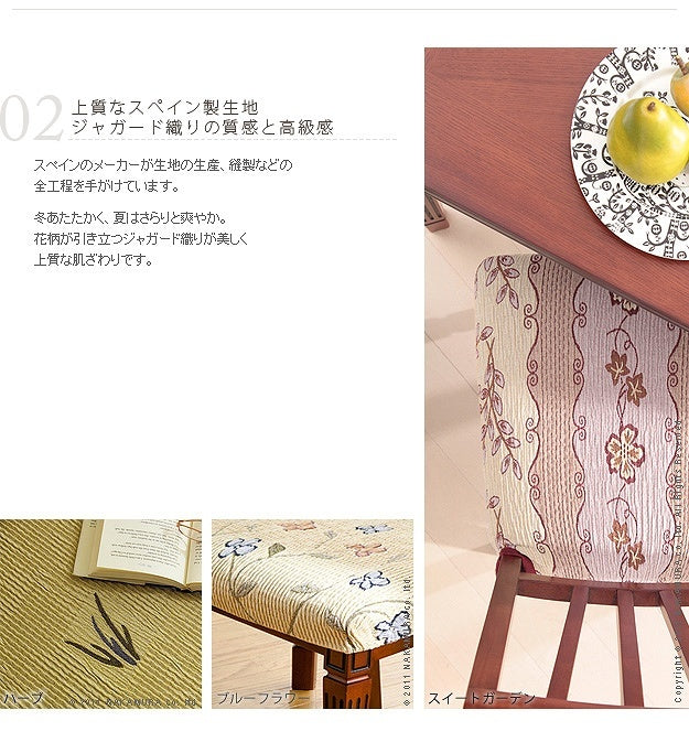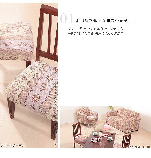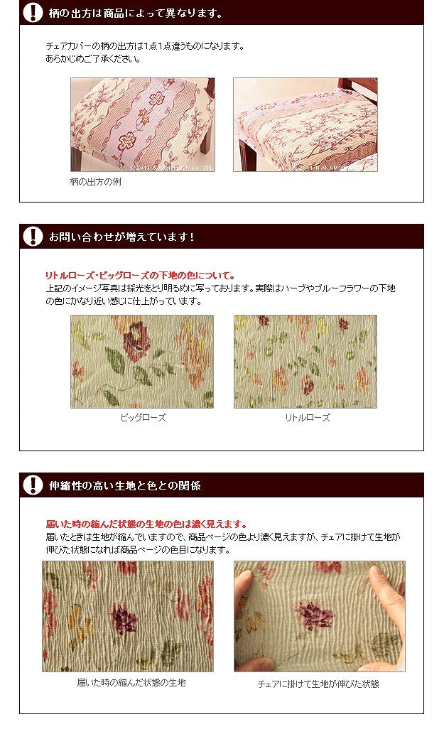 | 商品説明 | ≪チェアーカバー・6枚組セット≫ 商品について:横方向に伸縮するストレッチ素材。簡単キレイにフィットします♪シックな花柄が引き立つ高級感あるジャガード織りが特徴。上質なスペイン製。洗濯OK!脱着も簡単♪ 適合チェアサイズ:座面幅34?48cm・奥行45cmまで カラー:ハーブ・ブルーフラワー・スイートガーデン・ビッグローズ・リトルローズ(商品によって柄の出方が違います) 材質:綿60%・ポリエステル38%・ポリウレタン2% ビッグローズ・リトルローズ-ポリエステル50%・綿4 |