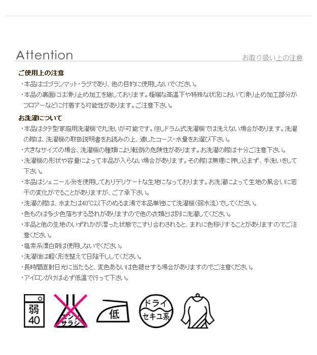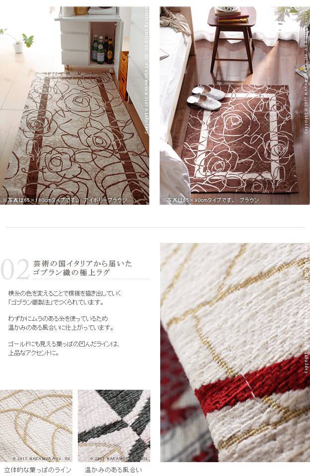 | 商品説明 | 商品について:カメリアが描かれたゴブラン織の上品なやわらかいマット。織物らしいフラットな質感と短い毛足で一年中さらさら。全面滑り止め加工でお子様からお年寄りまで足元安心♪洗濯可。床暖房・ホットカーペット対応。 サイズ(cm):65x240・1.4kg カラー:全8バリエーション・画像2を参照 材質:アクリル40%・綿30%・ポリエステル30% 完成品 |