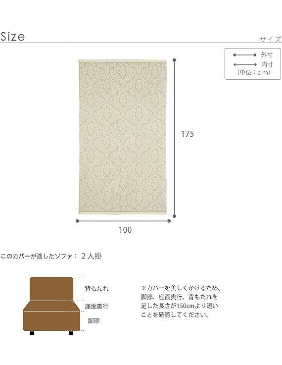 | 商品説明 | 商品について:ポルトガル製綿100%のソファーカバー。上品なダマスク柄でソファがエレガントに生まれ変わります。 サイズ(cm):100x175 ※カバーを美しく掛けるため、脚部+座面奥行き+背もたれ高さ=150cm以下であることを確認してください。 材質:綿100% |