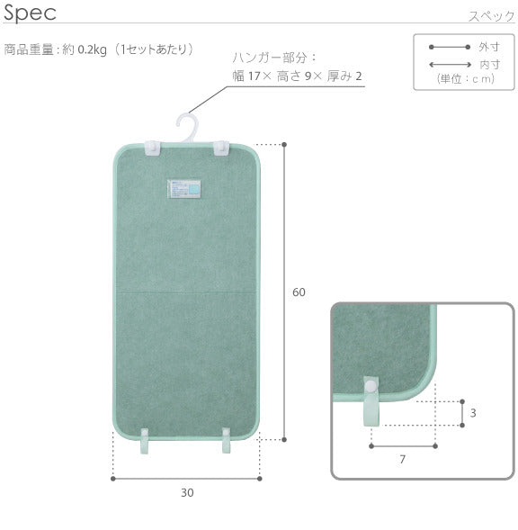 | 商品説明 | 【セット構成】 調湿シートx5枚 ハンガーx5個 【仕様】 表地・裏地:ポリエステル100% 中身:シリカゲルB型 ハンガー:ポリスチレン 完成品 【サイズ】 30x60cm(1枚当たり) 重量:約0.2kg(1枚当たり) |