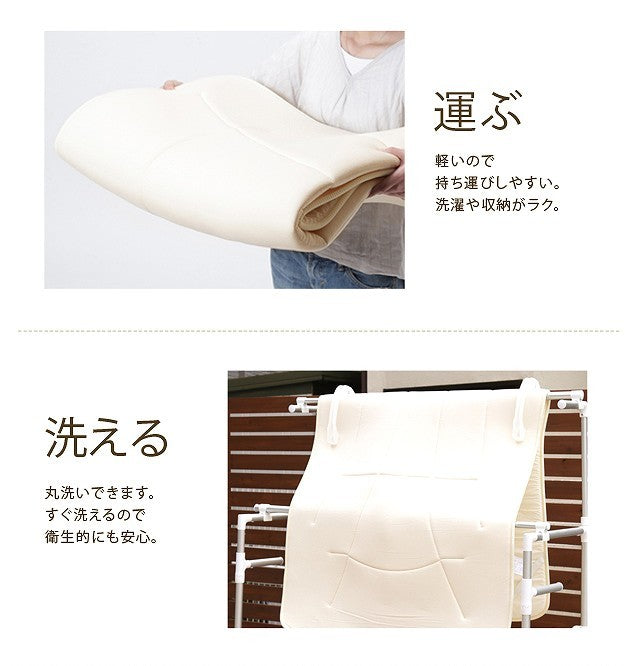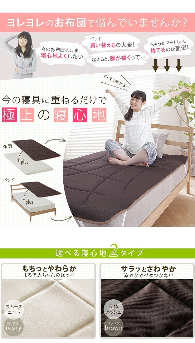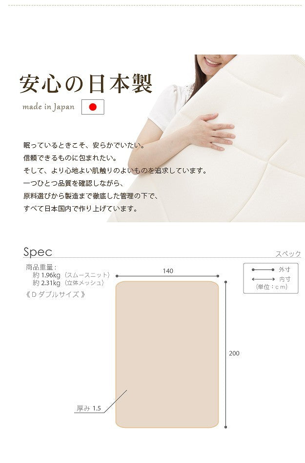 | 商品説明 | 商品について:お手持ちのマットレスや敷き布団に重ねるだけで寝心地UP。ふかふか敷きパッドコンフォートプラスダブル。高反発で体圧分散性が高いクッション材(特殊な構造の繊維テイジンV-Lap)が腰の沈み込みを防ぎ、寝姿勢を強力サポート☆軽くて薄いのでお洗濯や持ち運びの際も便利です。アイボリーは柔らかい肌触りのスムースニット、ブラウンは湿気を逃し通気性の良い立体メッシュ。2タイプの側生地を用意しました。 サイズ(cm):幅140x奥行200x厚さ1.5cm 重量:ニット-約1.96kg・メッシュ-約2.31kg バリエーション:スムースニット(アイボリー)・立体メッシュ(ブラウン) 材質:表地-[スムースニット]綿100%・[立体メッシュ]ポリエステル100%、裏地-ポリエステル65%・綿35%、中素材-ポリエステル100%(テイジンV-Lap使用) 完成品 日本製 |