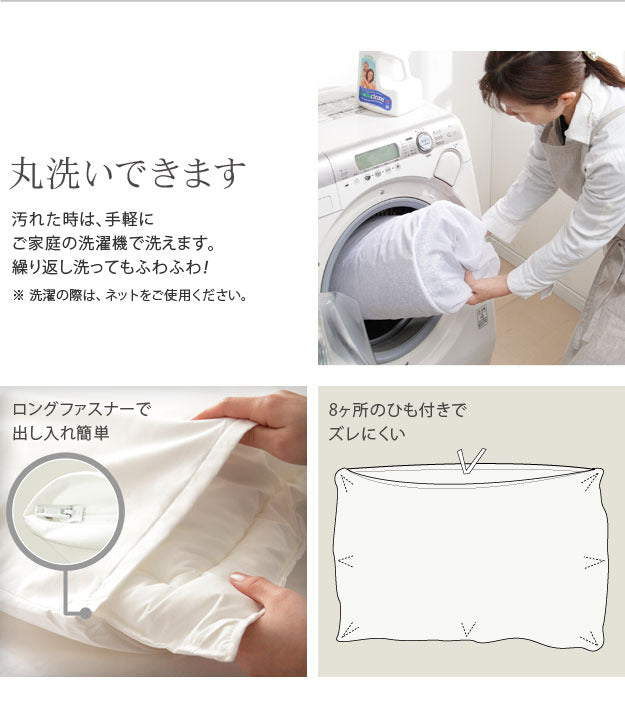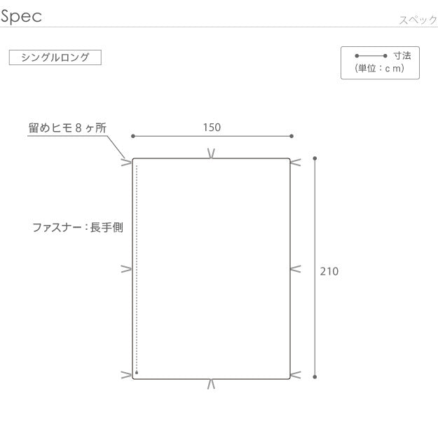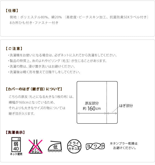 | 商品説明 | 【カラーバリエーション】 キャメルベージュ・ホワイト・ブライトピンク 【仕様】 側地:ポリエステル80%、綿20%(高密度・ピーチスキン加工・抗菌防臭SEKラベル付) 8カ所ひも付・ファスナー付 【サイズ】 150x210cm 重量:約0.9kg |