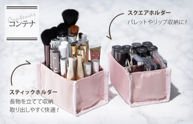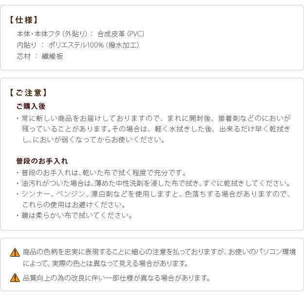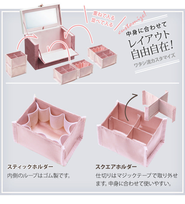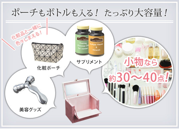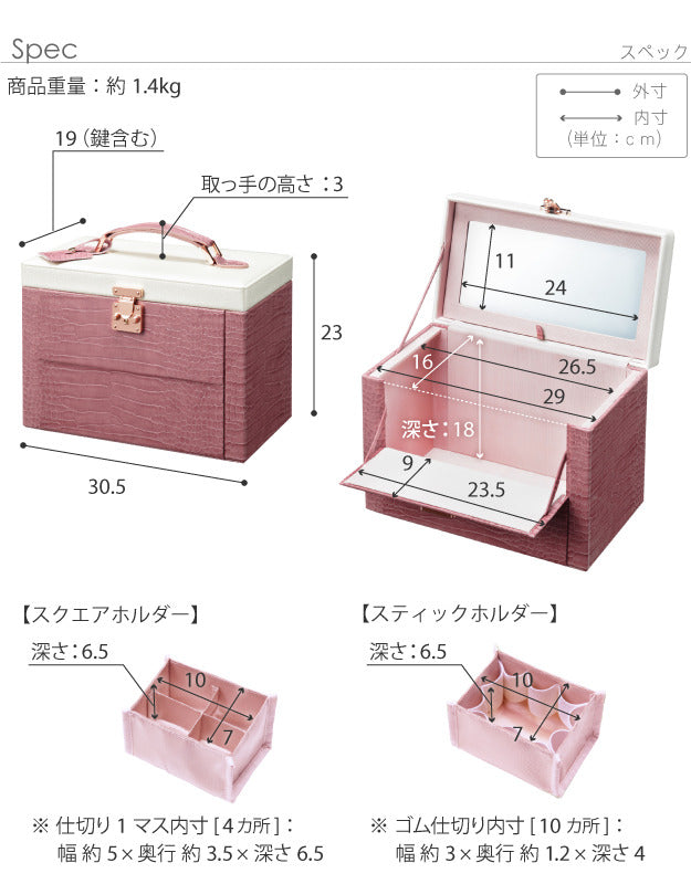 | 商品説明 | 【カラーバリエーション】 ブラウン・ピンク 【仕様】 本体(外貼り):合成皮革(PVC) 本体蓋(外貼り):合成皮革(PVC) 内貼り:ポリエステル100%(撥水加工) 芯材:繊維板 ◎完成品 【サイズ】 幅30.5x奥行19x高さ23cm 重量:約1.4kg 本体内寸:幅29(26.5)x奥行16x高さ18cm ミラーサイズ:幅24x高さ11cm・フチ2cm フラップ部:幅23.5x奥行9cm コンテナ内寸:幅10x奥行7x高さ6.5cm コンテナ(4仕切り1マス):幅約5x奥行約3.5x高さ6.5cm(x4マス) コンテナ(ゴム仕切り):幅約3x奥行約1.2x高さ4cm(x10箇所) 持ち手立ち上がり:3cm |