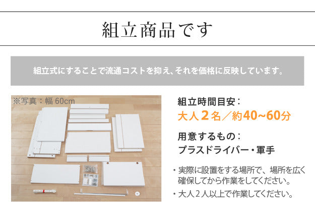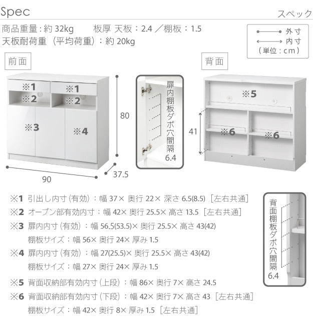 | 商品説明 | 【仕様】 本体:プリント紙化粧パーティクルボード 前面:合成樹脂化粧繊維板 引出し:スライドレール付 ◎組立式 【サイズ】 本体:幅90x奥行37.5x高さ80cm 重量:約32kg 引出内寸(有効):幅37x奥行22x高さ6.5(8.5)cm(2杯) オープン部有効内寸:幅42x奥行25.5x高さ13.5cm(2か所) 扉内内寸(左/右)(間口):幅56.5(53.5)/27(25.5)x奥行25.5x高さ43(42)cm 棚板サイズ(大/小):幅56/27x奥行24cm・厚み15mm ダボピッチ(扉内・背面):6.4cmピッチで5穴 背面収納部有効内寸(上段):幅86x奥行7x高さ24.5cm 背面収納部有効内寸(下段):幅42x奥行7x高さ43cm(2か所) 背面収納部棚板サイズ:幅42x奥行8cm・厚み15mm(x2) |