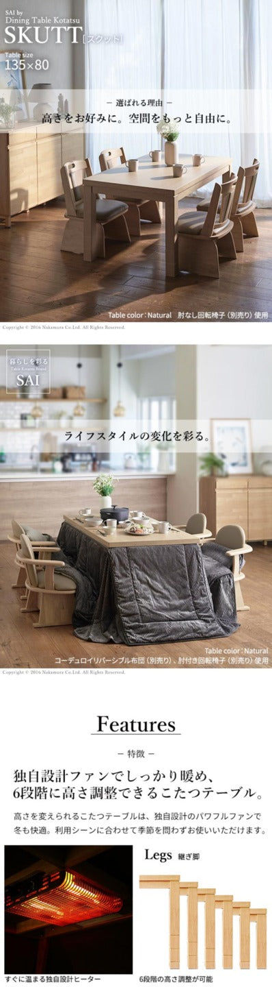 パワフルヒーター6段階に高さ調節できるダイニングこたつ スクット 135x80cm SAI 彩 長方形 ダイニングテーブル リビング コタツ 炬燵 本体のみ ハイタイプ ファン付き 省エネ 高さ調節 継ぎ脚 ナチュラル ベージュ ブラウン 木目 天然木 mu-g0100119 店舗 カフェ ラウンジ ロビー ホテル 法人 電気こたつ こたつ 季節 空調家電 家電 北欧 モダン 家具 インテリア ナチュラル テイスト 新生活 オススメ おしゃれ