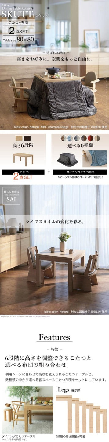 パワフルヒーター 6段階に高さ調節できるダイニングこたつ スクット 80x80cm+専用省スペースこたつ布団 2点セット SAI 彩 コタツ 長方形 ダイニングテーブル 布団セット 掛け布団 ハイタイプこたつ ファン付き ブラウン 木目 ナチュラル ベージュ 省エネ mu-i-1100137 店舗 カフェ ラウンジ ロビー ホテル 法人 電気こたつ こたつ 季節 空調家電 家電 北欧 モダン 家具 インテリア ナチュラル テイスト 新生活 オススメ おしゃれ