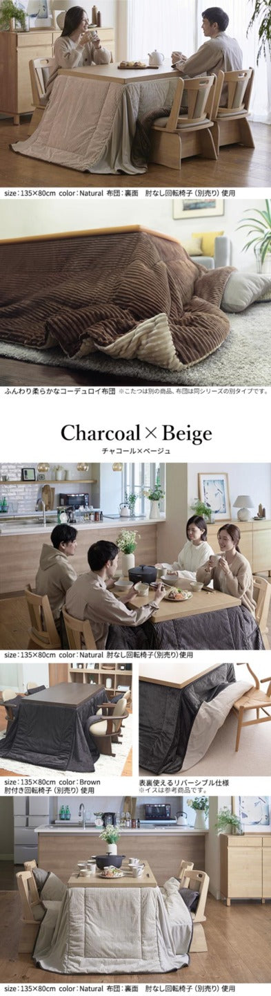 | 商品説明 | 【セット構成】 こたつ本体x1・こたつ布団x1 【カラーバリエーション】 ■こたつ本体 ブラウン・ナチュラル ■こたつ布団 ブラウン×ベージュ・チャコール×ベージュ・サックス×ベージュ しじら織り・ベージュ×グレー・レンガ×ブラウン 【仕様】 ■こたつ本体 天板:繊維板(転写プリント) 脚部:天然木(ラバーウッド) 塗装:ウレタン樹脂塗装 薄型石英管ヒーター(中間スイッチ式) ヒーター消費電力:500W コード長さ:約3m ◎一部組立(脚部取付) ■コーデュロイリバーシブルこたつ布団 表地:ポリエステル100%(コーデュロイ) 裏地:ポリエステル100%(コーデュロイ) コーナー部分表地:ポリエステル100%(コーデュロイ) コーナー部分裏地:ポリエステル100%(フリース) 中綿:ポリエステル100% ■しじら織りこたつ布団 表地:綿100% コーナー部分:アクリル100% 裏地:アクリル100% 中綿:ポリエステル100% ■はっ水リバーシブルこたつ布団 表地:ポリエステル100%(はっ水フランネル) 裏地:ポリエステル100%(フリース) コーナー部分:ポリエステル100%(フランネル・フリースの2枚合わせ) 中綿:ポリエステル100% 【サイズ】 ■こたつ本体 幅80x奥行80x高さ45/50/55/60/65/70cm(継ぎ脚10cmx2個 5cmx1個) 重量:約18kg ■布団 [しじら織り]240x240cm・中綿約1kg [はっ水リバーシブル]242x242cm・中綿約480g [コーデュロイリバーシブル]242x242cm・中綿約930g |