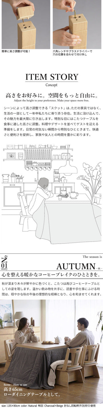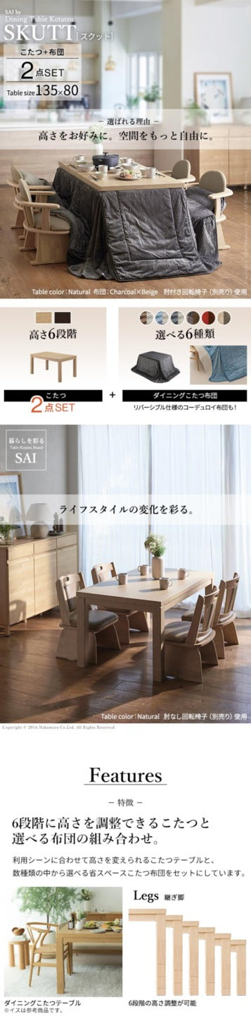パワフルヒーター 6段階に高さ調節できるダイニングこたつ スクット 135x80cm+専用省スペースこたつ布団 2点セット SAI 彩 コタツ 長方形 ダイニングテーブル 布団セット 掛け布団 ハイタイプこたつ ファン付き ブラウン 木目 ナチュラル ベージュ 省エネ mu-i-1100139 店舗 カフェ ラウンジ ロビー ホテル 法人 電気こたつ こたつ 季節 空調家電 家電 北欧 モダン 家具 インテリア ナチュラル テイスト 新生活 オススメ おしゃれ