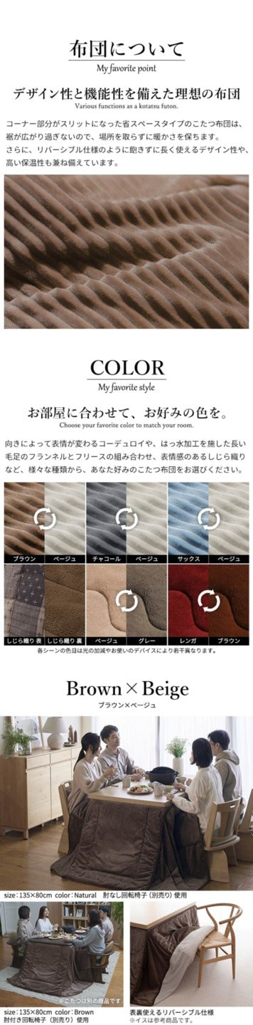 | 商品説明 | 【セット構成】 こたつ本体x1・こたつ布団x1 【カラーバリエーション】 ■こたつ本体 ブラウン・ナチュラル ■こたつ布団 ブラウン×ベージュ・チャコール×ベージュ・サックス×ベージュ しじら織り・ベージュ×グレー・レンガ×ブラウン 【仕様】 ■こたつ本体 天板:繊維板(転写プリント) 脚部:天然木(ラバーウッド) 塗装:ウレタン樹脂塗装 薄型石英管ヒーター(中間スイッチ式) ヒーター消費電力:500W コード長さ:約3m ◎一部組立(脚部取付) ■コーデュロイリバーシブルこたつ布団 表地:ポリエステル100%(コーデュロイ) 裏地:ポリエステル100%(コーデュロイ) コーナー部分表地:ポリエステル100%(コーデュロイ) コーナー部分裏地:ポリエステル100%(フリース) 中綿:ポリエステル100% ■しじら織りこたつ布団 表地:綿100% コーナー部分:アクリル100% 裏地:アクリル100% 中綿:ポリエステル100% ■はっ水リバーシブルこたつ布団 表地:ポリエステル100%(はっ水フランネル) 裏地:ポリエステル100%(フリース) コーナー部分:ポリエステル100%(フランネル・フリースの2枚合わせ) 中綿:ポリエステル100% 【サイズ】 ■こたつ本体 幅135x奥行80x高さ45/50/55/60/65/70cm(継ぎ脚10cmx2個 5cmx1個) 重量:約23kg ■こたつ布団 [しじら織り]295x240cm・中綿約1.35kg [はっ水リバーシブル]297x242cm・中綿約680g [コーデュロイリバーシブル]297x242cm・中綿約1.31kg |
