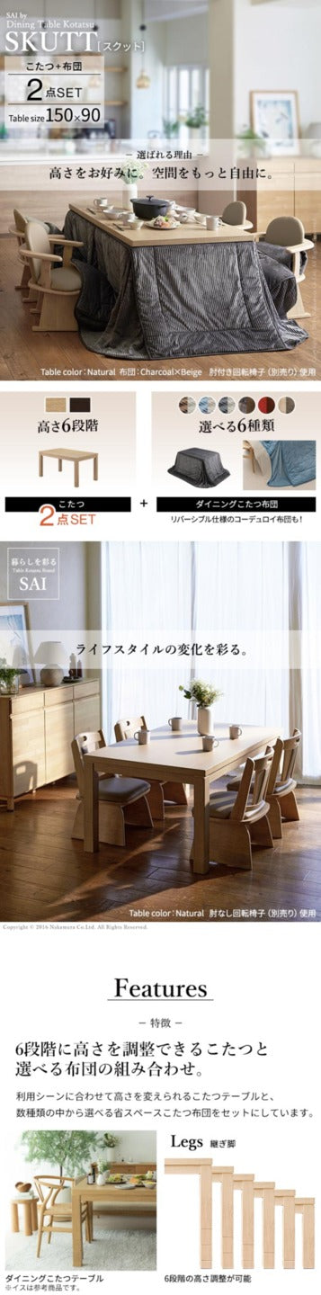 パワフルヒーター 6段階に高さ調節できるダイニングこたつ スクット 150x90cm+専用省スペースこたつ布団 2点セット SAI 彩 コタツ 長方形 ダイニングテーブル 布団セット 掛け布団 ハイタイプこたつ ファン付き ブラウン 木目 ナチュラル ベージュ 省エネ mu-i-1100140 店舗 カフェ ラウンジ ロビー ホテル 法人 電気こたつ こたつ 季節 空調家電 家電 北欧 モダン 家具 インテリア ナチュラル テイスト 新生活 オススメ おしゃれ