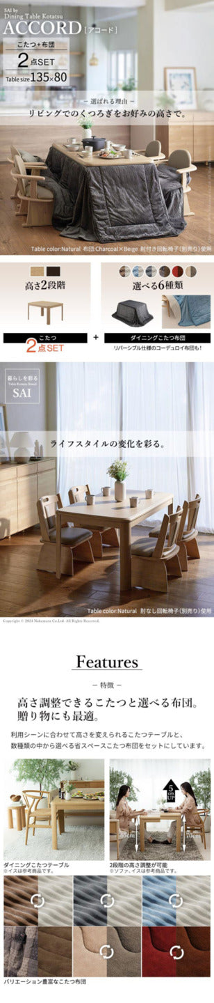 パワフルヒーター 高さ調節機能付きダイニングこたつ アコード 135x80cm+専用省スペースこたつ布団 2点セット SAI 彩 コタツ 長方形 ダイニングテーブル リビング 布団セット 掛け布団 ハイタイプ ファン付き ブラウン 木目 ナチュラル ベージュ 省エネ mu-i-1100242 店舗 カフェ ラウンジ ロビー ホテル 法人 電気こたつ こたつ 季節 空調家電 家電 北欧 モダン 家具 インテリア ナチュラル テイスト 新生活 オススメ おしゃれ