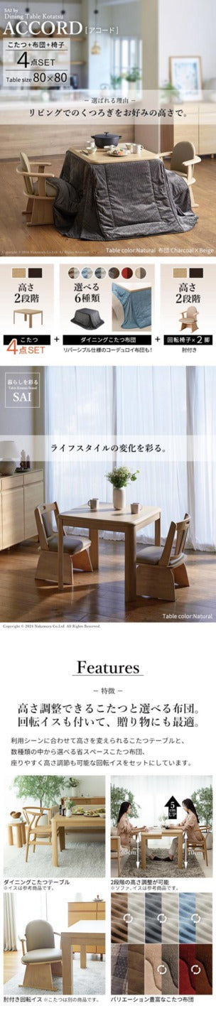 パワフルヒーター 高さ調節機能付きダイニングこたつ アコード 80x80cm 4点セット こたつ本体+専用省スペースこたつ布団+肘付き回転椅子2脚 SAI 彩 こたつ 正方形 ダイニングテーブル 掛け布団 ファン付き 高さ調節 継ぎ脚 おしゃれ ナチュラル ブラウン mu-i-2700104 店舗 カフェ ラウンジ ロビー ホテル 法人 電気こたつ こたつ 季節 空調家電 家電 北欧 モダン 家具 インテリア ナチュラル テイスト 新生活 オススメ おしゃれ