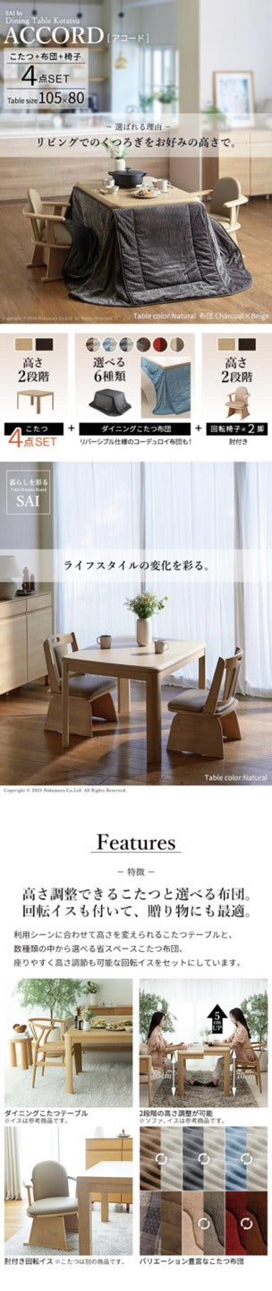 パワフルヒーター 高さ調節機能付きダイニングこたつ アコード 105x80cm 4点セット こたつ本体+専用省スペースこたつ布団+肘付き回転椅子2脚 SAI 彩 こたつ 長方形 ダイニングテーブル 掛け布団 ファン付き 高さ調節 継ぎ脚 おしゃれ ナチュラル ブラウン mu-i-2700105 店舗 カフェ ラウンジ ロビー ホテル 法人 電気こたつ こたつ 季節 空調家電 家電 北欧 モダン 家具 インテリア ナチュラル テイスト 新生活 オススメ おしゃれ