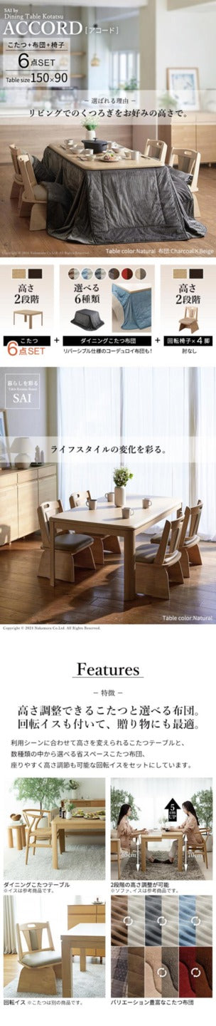パワフルヒーター 高さ調節機能付きダイニングこたつ アコード 150x90cm 6点セット こたつ本体+専用省スペースこたつ布団+回転椅子4脚 SAI 彩 こたつ 長方形 ダイニングテーブル 掛け布団 ファン付き 高さ調節 継ぎ脚 おしゃれ ナチュラル ブラウン mu-i-2700132 店舗 カフェ ラウンジ ロビー ホテル 法人 電気こたつ こたつ 季節 空調家電 家電 北欧 モダン 家具 インテリア ナチュラル テイスト 新生活 オススメ おしゃれ