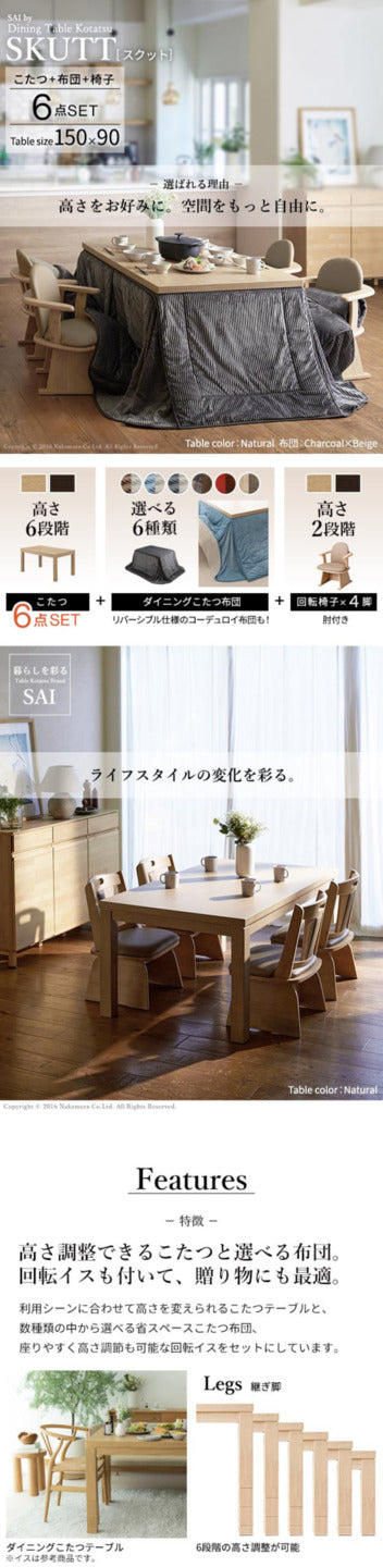 パワフルヒーター6段階に高さ調節できるダイニングこたつ スクット 150x90cm 6点セット こたつ本体+専用省スペースこたつ布団+肘付き回転椅子4脚 SAI 彩 長方形 ダイニングテーブル 掛け布団 ファン付き 高さ調節 継ぎ脚 イス おしゃれ ナチュラル ブラウン mu-i-3300264 店舗 カフェ ラウンジ ロビー ホテル 法人 電気こたつ こたつ 季節 空調家電 家電 北欧 モダン 家具 インテリア ナチュラル テイスト 新生活 オススメ おしゃれ