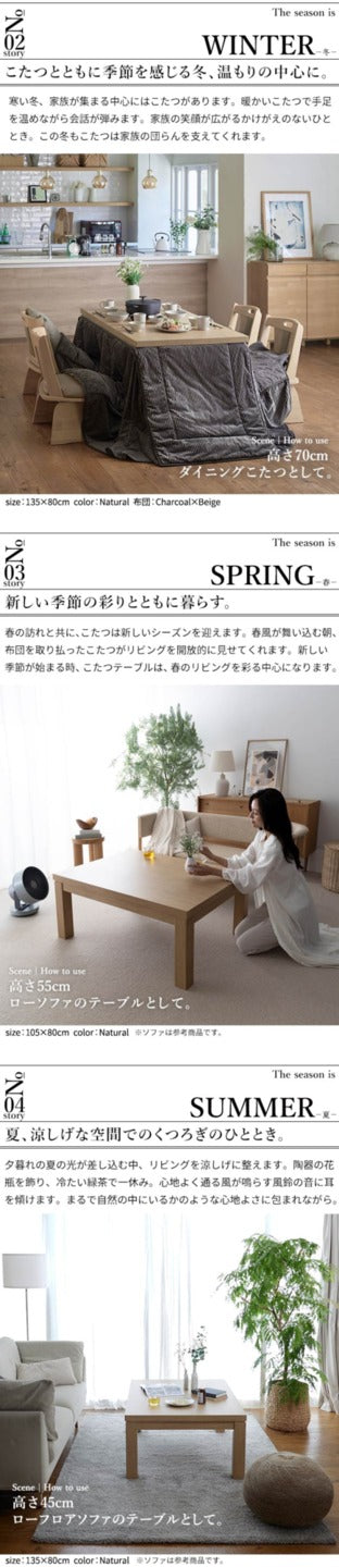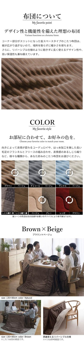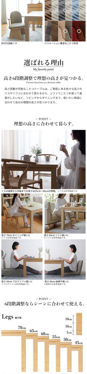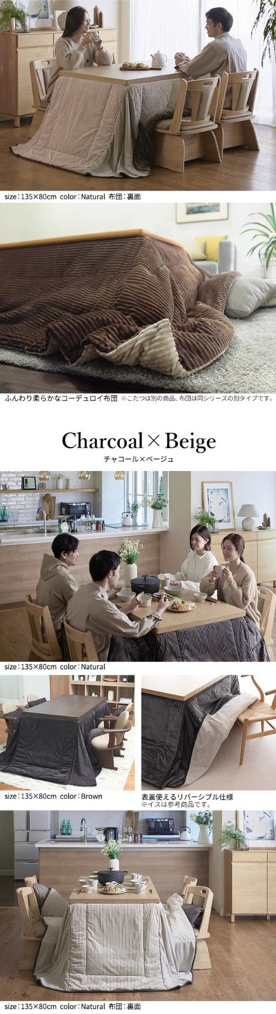 | 商品説明 | 【セット構成】こたつ本体x1台/こたつ布団x1枚/肘付き回転椅子x4脚 【こたつバリエーション】ブラウン・ナチュラル 【布団バリエーション】ブラウン×ベージュ・チャコール×ベージュ・サックス×ベージュ しじら織り・ベージュ×グレー・レンガ×ブラウン 【仕様】 ■こたつ本体 天板:繊維板(転写プリント) 脚部:天然木(ラバーウッド) 薄型石英管ヒーター(500W・中間スイッチ式) コード長さ:約3m ◎一部組立(脚部取付) ■コーデュロイリバーシブルこたつ布団 表地:ポリエステル100%(コーデュロイ) 裏地:ポリエステル100%(コーデュロイ) コーナー部分表地:ポリエステル100%(コーデュロイ) コーナー部分裏地:ポリエステル100%(フリース) 中綿:ポリエステル100% ■しじら織りこたつ布団 表地:綿100% コーナー部分:アクリル100% 裏地:アクリル100% 中綿:ポリエステル100% ■はっ水リバーシブルこたつ布団 表地:ポリエステル100%(はっ水フランネル) 裏地:ポリエステル100%(フリース) コーナー部分:ポリエステル100%(フランネル・フリースの2枚合わせ) 中綿:ポリエステル100% ■回転椅子 ナチュラル色フレーム:天然木(ラバーウッド) ブラウン色フレーム:天然木(アカシア) 座面:合成皮革 ◎一部組立(脚部取付) 【サイズ】 ■こたつ本体 幅150x奥行90x高さ45/50/55/60/65/70cm(継ぎ脚10cmx2個 5cmx1個)・約28kg ■こたつ布団 [しじら織り]310x250cm・中綿約1.55kg [はっ水リバーシブル]312x252cm・中綿約780g [コーデュロイリバーシブル]312x252cm・中綿約1.56g ■肘付き回転椅子 幅55x奥行53x高さ74(69)cm・約10kg |