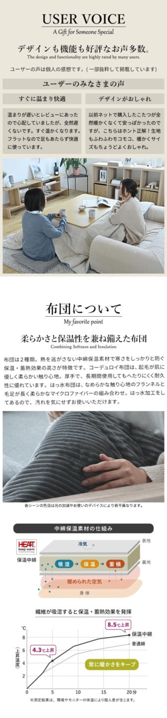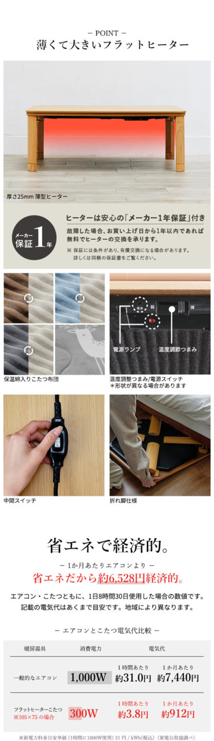 | 商品説明 | 【セット構成】 こたつ本体x1 こたつ布団x1 【カラーバリエーション】 ■こたつ本体 ブラウン・ナチュラル ■こたつ布団 ブラウン×ベージュ チャコール×ベージュ サックス×ベージュ エルク柄グレー[アーバンスタイル] 【仕様】 ■こたつ本体 天板:繊維板(木目転写) 脚部:天然木(ラバーウッド) フラットヒーター(130W、中間スイッチ式) ◎完成品 ■保温綿入りコーデュロイこたつ布団 表地:ポリエステル100%(コーデュロイ) 裏地:ポリエステル100%(コーデュロイ) 中綿:ポリエステル100%(ポリエステル綿68%・サラウォーム保温綿32%) ■保温綿入りはっ水こたつ布団エルク柄 表地:ポリエステル100%(フランネル) 撥水・防汚加工 裏地:ポリエステル100% 中綿:ポリエステル100%(ポリエステル綿68%・保温綿32%) 【サイズ】 ■こたつ本体 幅75x奥行75x高さ40cm 重量:約16kg 天板:幅75x奥行75cm・厚み15mm・約6kg 脚間:59/59cm 中天板下高さ:31.5/36.5cm 折り畳み高さ:11cm ■こたつ布団 190x190cm 中綿重量: コーデュロイこたつ布団:約580g はっ水こたつ布団エルク柄:約530g |
