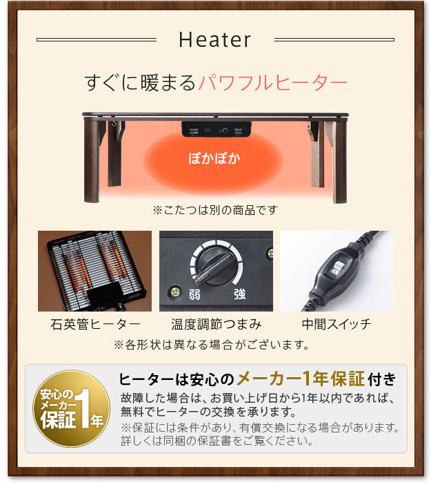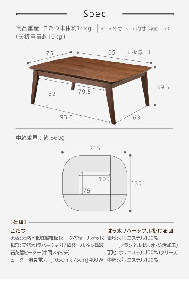 | 商品説明 | 【セット構成】 こたつ本体x1 掛布団x1 【カラーバリエーション】 ■こたつ本体 ウォールナット(ブラウン)・オーク(ナチュラル) ■掛布団 レンガxブラウン・ベージュxグレー・グリーンxグレー・ネイビーxブラウン 【仕様】 ■こたつ本体 天板:天然木化粧繊維板(ウォールナット/オーク) 幕板・脚部:天然木(ラバーウッド) 石英管ヒーター(400W、中間スイッチ式) ◎一部組立 ■掛布団 表地:ポリエステル100% 裏地:ポリエステル100%(フリース) 撥水・防汚加工 【サイズ】 ■こたつ本体 幅105x奥行75x高さ39.5cm 重量:約18kg 天板サイズ:幅105x奥行75cm・厚み30mm・約10kg ■掛布団 サイズ:215x185cm・中綿:約860g やぐら面サイズ:105x75cm |