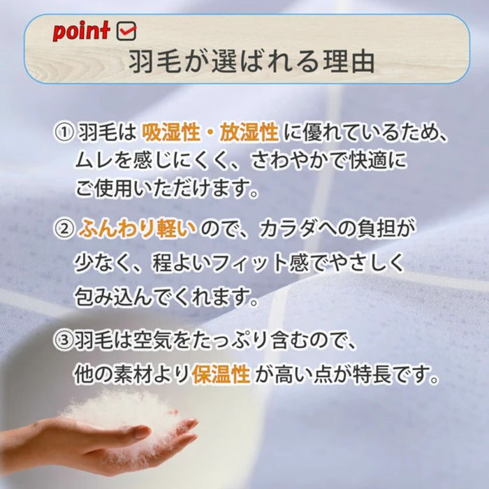 | 素材 | ふとんがわ:ポリエステル100% 詰めもの:ダウン50% フェザー50% 0.25kg |