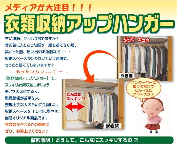 | 商品説明 | ■生産地:日本 ●衣類を段違いに収納できるので、服が取出しやすくて掛けやすい! ●伸縮式ハンガーバーの中間リングがあっても取付け可能! ●付けカンタン、掛けるだけ♪ ●伸縮自在だから、どこでも無駄なくタップリ収納♪ 【商品による注意事項】 *丸いハンガーパイプの場合、直径4.0cmまで対応。 *四角いハンガーの場合は、設置できない場合もあります。 *水平が保っていないハンガーパイプヘの設置はしないで下さい。 *洋服の厚さ、ハンガーの厚さによって収納量は事なります。 *設置前より収納量が増える為、荷重が増えます。 *強度が不十分なハンガーパイプには使用しないで下さい。 *丈が長い衣類の場合、裾が地面にあたる場合が御座います。 *正面から見て短い方が手前に来るように本体を掛けて下さい。 |