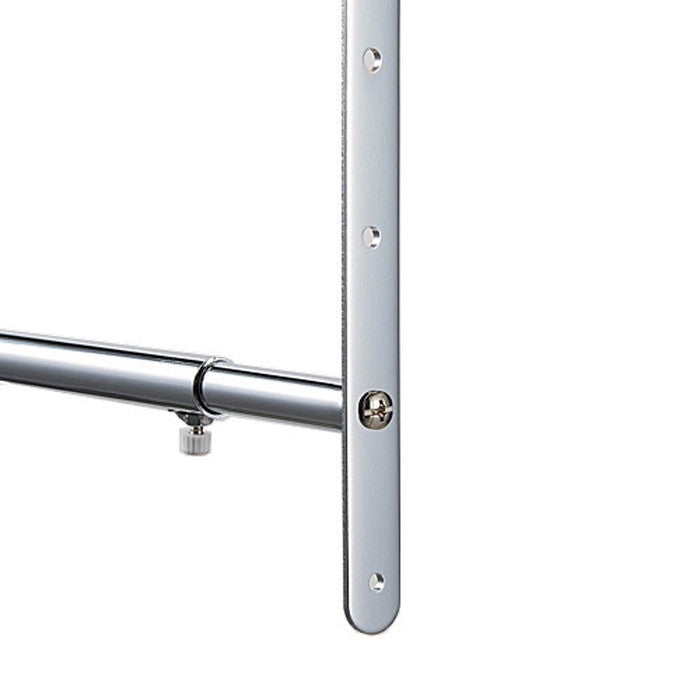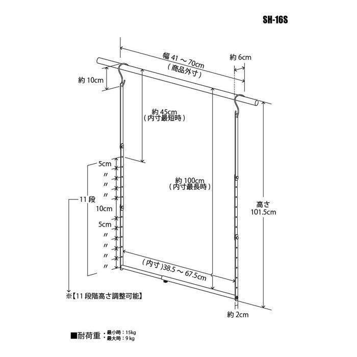 | サイズ | ■商 品 サイズ/ W 41?70×D 9.3×H 72.5?101.7cm *ハンガーバーの太さは5.2cmまで対応 ■耐荷重 ・幅最小時15Kg ・幅最大時 9Kg ■その他機能 ・高さ5cmピッチで11段階調整可能 ・ハンガーバーの太さ約5.2cm頃OK ・フレームを折り畳んでも使用可能 ■梱包サイズ:1個/40x10x2.3cm ■梱包重量 :1個/1.6Kg |