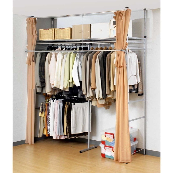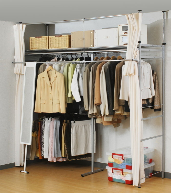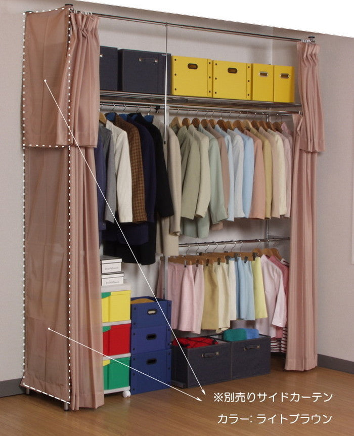 | 商品説明 | ●縦にも横にも伸縮するので設置場所を選びません。天井面の突っ張りパイプは前後それぞれ別に伸縮するので、下がり天井(梁)など、前後に段差があってもしっかり設置出来て安全です。さらに複雑な天井構造では、カーテンレールパイプを取り外す事で対応できます。 ●脱いだ服に風を通せるフロントハンガー付き。 ●カーテンを閉じた状態でもかけられるので、ちょっと掛けに便利です。 ●衣類はもちろん、上段の棚にはケース類やバッグ等、天井いっぱいまで空きを残さず たっぷり収納出来ます。 ●上下左右伸縮自在な、2段式カーテン付なのでホコリを寄せ付けず壁面スッキリ目隠収納。 ●カーテンは取り外し簡単、洗濯機で丸洗いOK! 乾きの早いポリエステル製。 ●前面カーテンはお好みのカーテンに付け替えて、お部屋に合わせて楽しめます。 ●別売りサイドカーテンを取付ければ、サイドからのホコリを防ぎ、 お部屋の中に置いても、見た目がすっきりします。紐でくくるだけで簡単に取付けられ、片側を壁付けせずに使う場合におすすめです。 ※サイドカーテンは別売りになります。 |