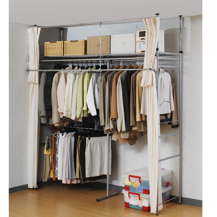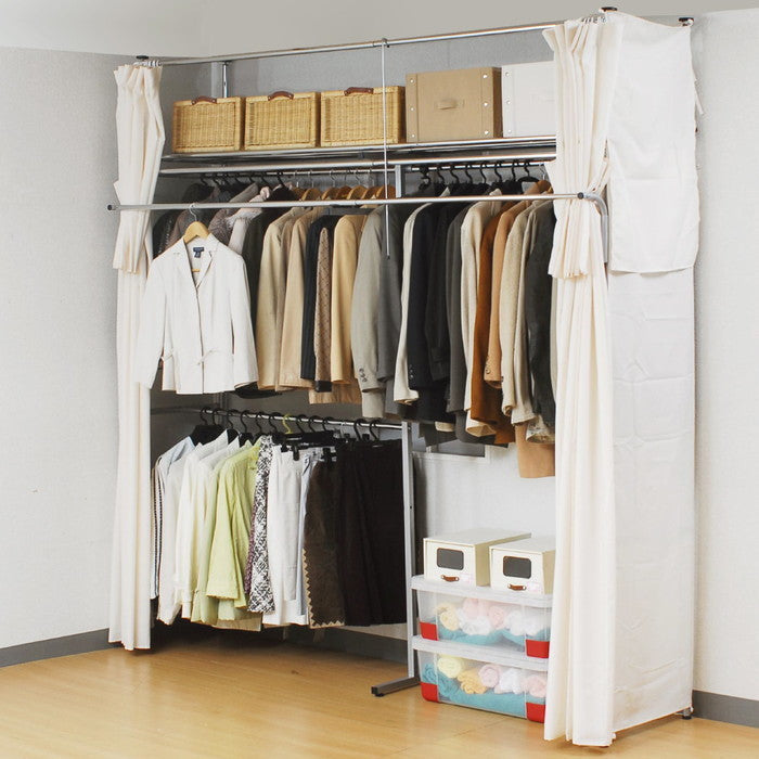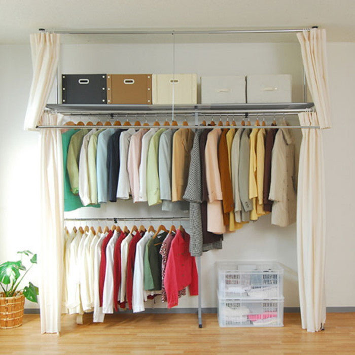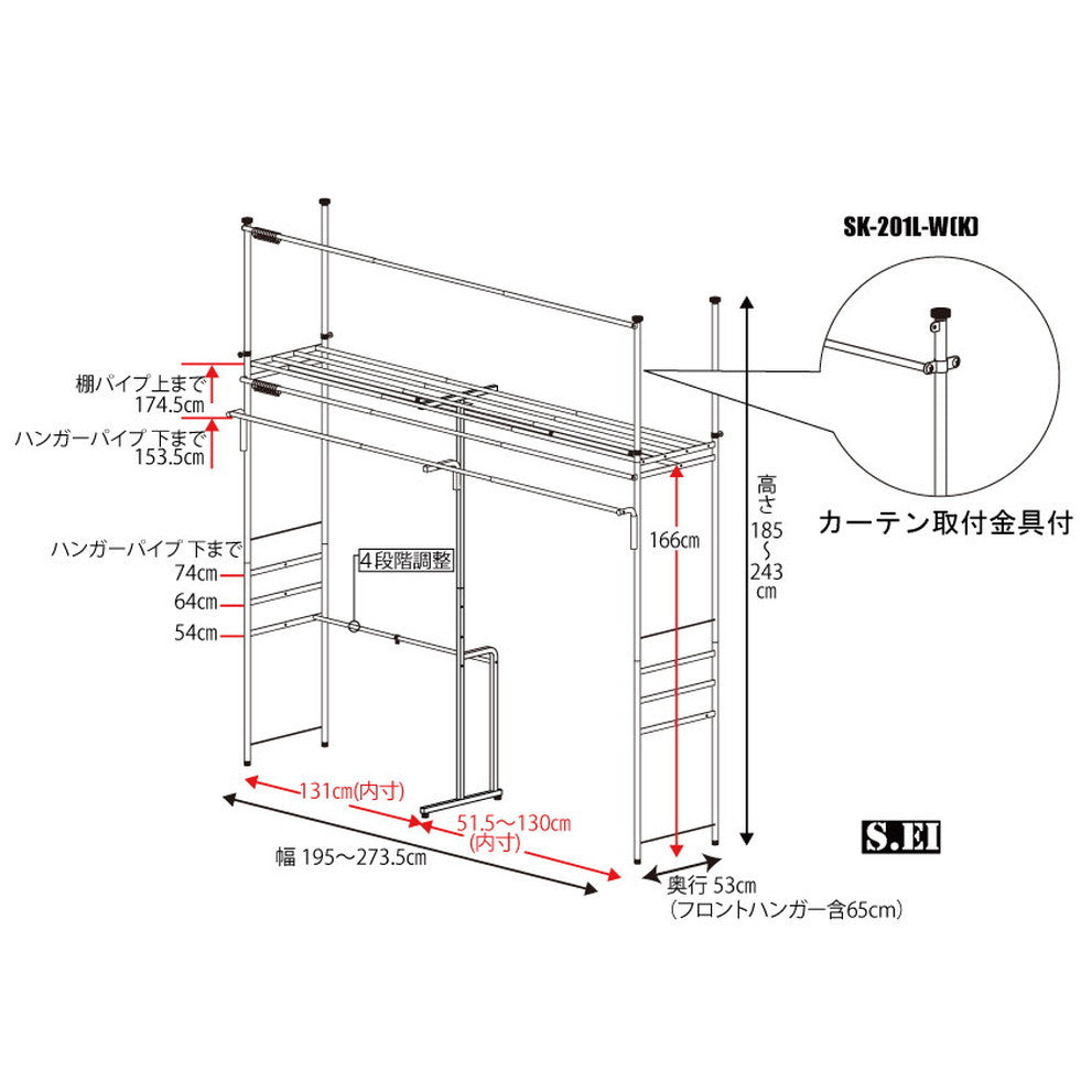 | サイズ | 商品サイズ(cm)幅:195?273.5cm奥行:53cm (フロントハンガー含65cm)高さ:185?243cm 全体許容耐荷重:約169kg ・上段ハンガー部分75Kg ・下段ハンガー部分12Kg ・フロントハンガー部分10Kg ・棚部分72kg 梱包サイズ/W 131 ×D 57 ×H 12.5cm |